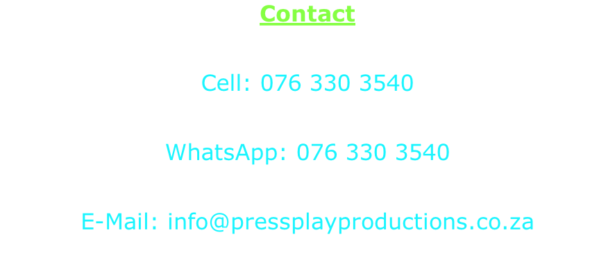 Contact  Cell: 076 330 3540  WhatsApp: 076 330 3540  E-Mail: info@pressplayproductions.co.za